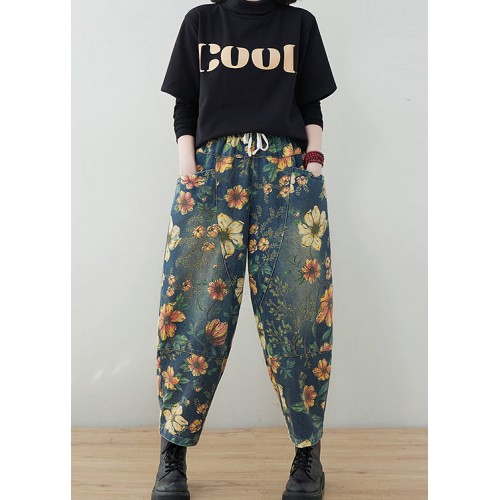 French Navy elastic waist drawstring pockets Print Denim Pants Spring