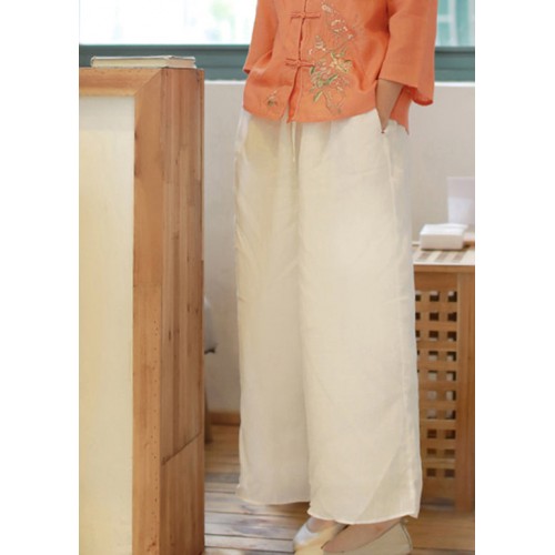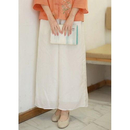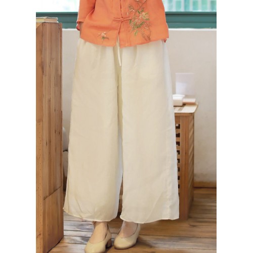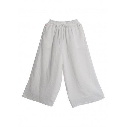Bohemian White elastic waist drawstring Pockets Linen wide leg Pants Spring