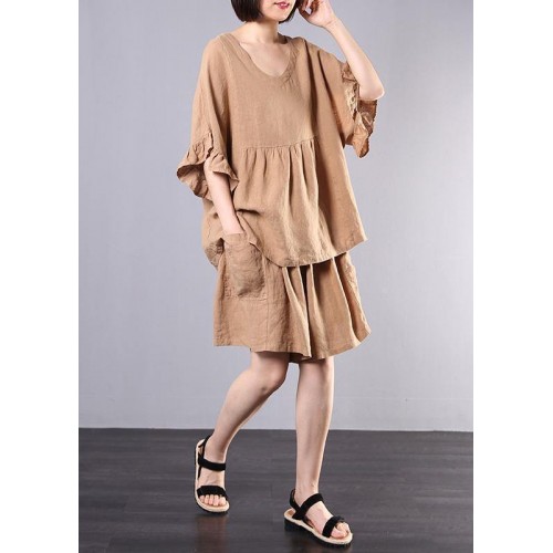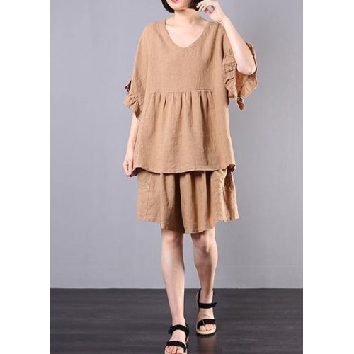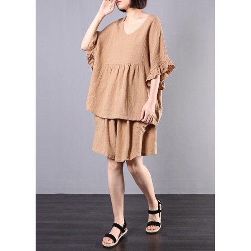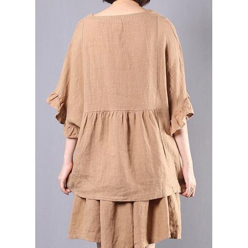 women casual cotton linen khaki two pieces ruffles sleeve blouse with fashion shorts